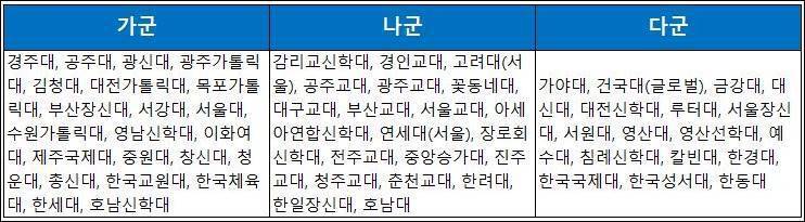아래 도표는 현 고3 학생들이 치를 2021학년도 대입 정시 모집 가군, 나군, 다군의 군별 모집 대학 현황이다.