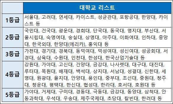 표를 보면 서울대와 서강대가 가군에서 모집하고, 고려대(서울)와 연세대(서울)는 나군에서 모집한다. 보통 서울대가 어떤 군에서 모집을 하느냐에 따라 고려대, 서강대, 연세대의 모집 군이 달라진다.
