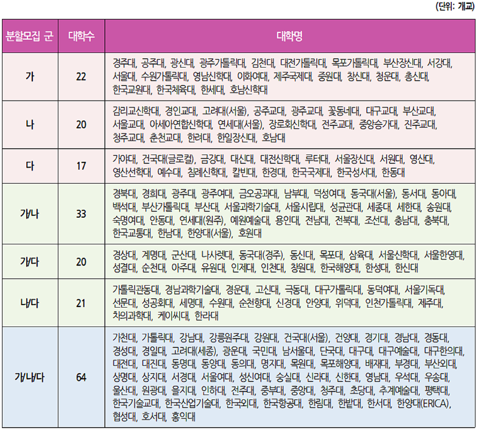 가군만 모집하는 대학은 22개교, 나군만 모집하는 대학은 20개교, 다군만 모집하는 대학은 17개교, 가·나군 모집 대학은 33개교, 가·다군 모집 대학은 20개교, 나·다군 모집 대학은 21개교, 가·나·다군 모집 대학은 64개교이다. 가·나·다군 모두에서 모집하는 대학이 가장 많다.